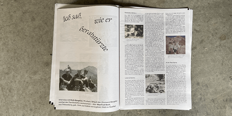 Die Zeitung «Geschichten aus den Bergen enthält Auszüge aus Tourenbüchern von Noldi Frommelt, ehem. Bergrettungschef, sowie Interviews mit Ruth Bargetze (über Manfred Beck); Imelda & Eugen Beck, ehem. Wirte Pfälzerhütte; Melanie Biedermann, Michael Biedermann & Corina Büchel Biedermann (über Johannes Biedermann); Ida Büchel (über Bruno & Michael Büchel); Christoph Frommelt, ehem. Bergrettungschef; Norbert Gantner, ehem. Bergrettungschef; Lore Mayer (über Marcel Mayer); Dominik Schädler, ehem. Bergrettungschef und Martin Sprenger (über Peter Sprenger).