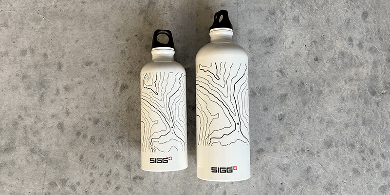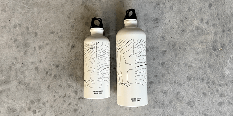 Auf den Trinkflaschen sind die Pfälzerhütte und Schutzhütte Adler mit den Höhenlinien der Umgebung eingezeichnet. Design: Liam Wohlwend. Konzept: Philipp Vogt & Laura Hilti. Produktion: BVD Druck & Verlag AG.
