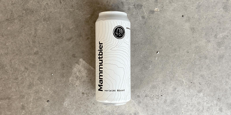 «Mammutbier verleiht Rüssel» ist der Slogan des Biers, auf dem sowohl «s’Mammut» wie auch die Pfälzerhütte und die Schutzhütte Adler sowie die Höhenlinien der Umgebung zu sehen sind. Design: Liam Wohlwend. Idee: René Keel. Konzept: Kurator:innen-Team. Produktion: Liechtensteiner Brauhaus AG.