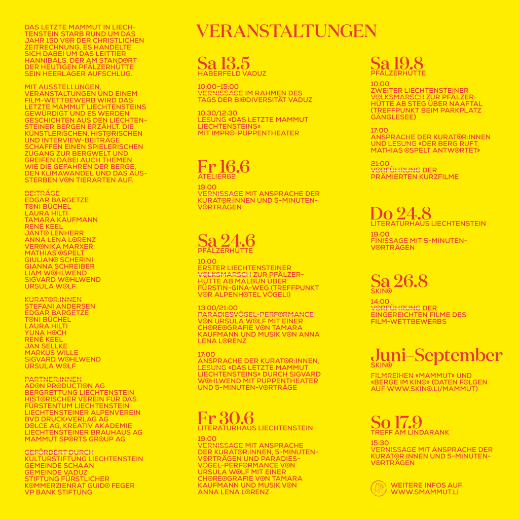 Mit Ausstellungen und Veranstaltungen wird im Jahr 2023 das letzte Mammuts Liechtensteins gewürdigt und es werden Geschichten von damals bis heute aus dem Gebiet der heutigen Pfälzerhütte erzählt. Die künstlerischen, historischen und Interview-Beiträge schaffen einen spielerischen Zugang zur Bergwelt und weisen gleichzeitig auf die Gefahren der Berge, den Klimawandel und das Aussterben von Tierarten hin.